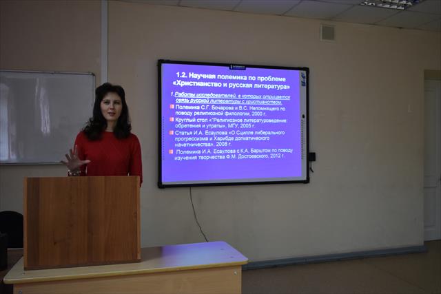 Непростому религиозному поиску писателя была посвящена лекция Золотухиной Олеси Юрьевны, доцента Сибирского института искусств им. Д. Хворостовского. Рассказав о дискуссиях в литературоведении вокруг изучения христианских традиций русской литературы, лектор обратилась к темам старообрядчества и войны в творчестве В.П. Астафьева. Олеся Юрьевна прокомментировала понятие «религиозный идеал» писателя, показала на примерах из текста, как он менялся с течением времени.