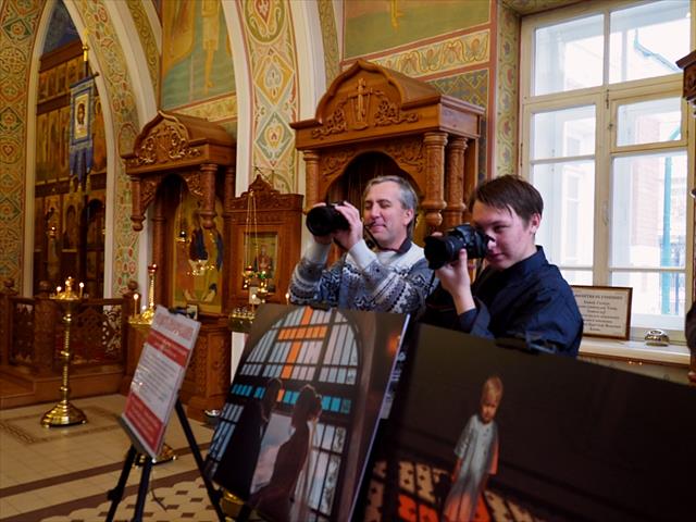 К моему возращения авторы фотографий рассказывали истории их создания. Юлия Рамазанова, автор шедевра, где малыш в крестильной рубашечке стоит в центре алого креста на полу, вспоминает, что в день крещения Артемия день был пасмурный, съёмка не задавалась, фотограф рассчитывала только на чудо. Оно и случилось: неожиданно выглянуло солнышко, луч заглянул в витраж храма и отбросил яркий крест на пол. Оставалось поставить туда мальчика.