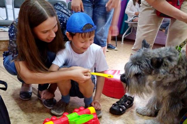 — Это специально обученные собаки, они работают по методу канис-терапии, — объясняет хозяйка двух из них, миттельшнауцеров Бостона и Яши, Евгения Фролова, — это такое направление в реабилитации детей с особенностями, когда во время игры с животными дети учатся общаться с другими людьми, лучше ориентироваться в пространстве и управлять своим телом. Всей пользы так сразу и не перечислить. Но самый важный момент — ребята испытывают много положительных эмоций во время таких занятий, часто улыбаются и смеются. Глядя на это трудно сдержать улыбку – все, от мало до велика, обнимают, гладят, кормят, водят на поводках и даже катаются по полу с собаками. А те терпеливо сносят детские манипуляции. Не протестуют животные даже во время игр в салон красоты и «айболита, покорно соглашаясь принимать воображаемые пилюли и примерять парик и очки. Евгения Фролова предводитель этой лохматой банды докторов. Помимо Бостона, первого и пока единственного в Хабаровске дипломированного канис-терапевта, в команде его друг Яша, а также два добрейших зенненхунда и один шнауцер. Крупные, лохматые, и идеально воспитанные собаки всегда вызывают настоящий восторг у детей.