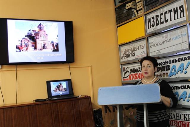 На этот раз юношеская библиотека собрала и традиционную аудиторию старшеклассников - участников клуба «Слово» и их товарищей по обучению в школе № 26 г. Краснодара. Ведь, тема лекции в рамках Всекубанского духовно-просветительного форума (Православная миссия русской литературы) – «Православные храмы в городе Краснодаре, в литературе и в нашей жизни» - заинтересовала многих.