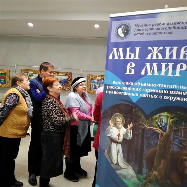 Сотрудники Церковного музея провели экскурсию с тифлокомментированием тактильных картин. Незрячие и слабовидящие познакомились с сюжетами выставки «Мы живем в мире», рассказывающими о гармонии с окружающей природой и дружбе с представителями животного мира православных святых, живших в разных уголках планеты в разные времена и эпохи.