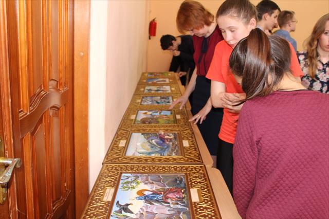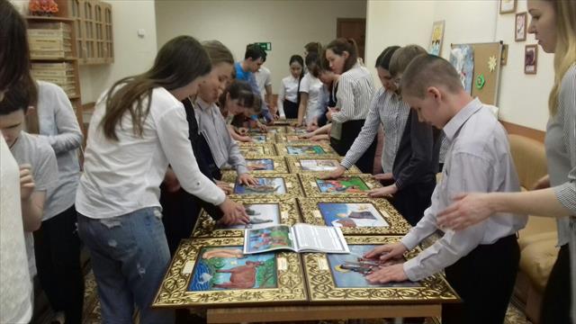 С 3 по 14 мая выставка объемно-тактильных картин «В мире добра» демонстрировалась в Чебоксарской общеобразовательной школе-интернате для обучающихся с ограниченными возможностями здоровья. С картинами детей знакомили тифлокомментаторы из числа студентов-волонтеров Чебоксарского медицинского колледжа под руководством преподавателя Елены Пархисенко, факультета дошкольной и коррекционной педагогики и психологии Чувашского государственного педагогического университета им. И. Я. Яковлева (Руководитель группы: Ирина Смирнова), Чувашского государственного института культуры и искусств (Руководитель группы: Наталья Герасимова), Они рассказывали о сюжетах картин, а также проводили с детьми яркие интерактивные занятия.