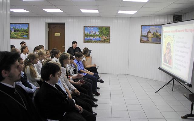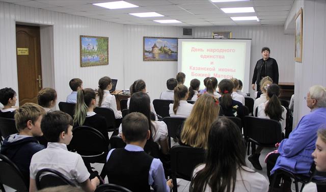 Перед просмотром мультипликационного фильма «Встреча», который прошел в нижнем этаже храма Святой Троицы, Марина Евгеньевна показала ребятам презентацию, рассказывающую о том, как возник праздник День народного единства и как он связан с празднованием Дня Казанской иконы Божией Матери. Дети узнали историю обретения иконы и то, как этот чудотворный образ помогал русскому народу в годы лихолетий.