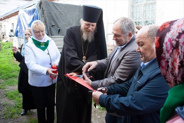 Почетное право перерезать красную ленту перед входом в помещение было предоставлено епископу Уржумскому и Омутнинскому Иоанну, совместно с главой Уржумского муниципального района Кировской области Виктором Васильевичем Силиным и главой Уржумского городского поселения Андреем Орестовичем Милюзиным. На открытии присутствовала директор КОГАУСО "Уржумский комплексный центр социального обслуживания населения" Наталья Николаевна Нечаева, а также волонтеры, жители города и приглашенные гости.