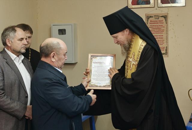 Затем Виктор Васильевич Силин вручил епископу Иоанну благодарственное письмо и тепло поблагодарил всех трудившихся при создании пункта выдачи горячего питания. После него слово было предоставлено Андрею Орестовичу Милюзину, который выразил надежду, что по завершении реализации проекта пункт выдачи горячего питания и духовной помощи будет существовать и дальше.
