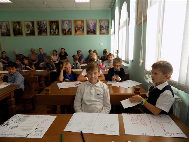 Не секрет, что не все дети, по разным объективным причинам, могут писать в десять лет (при сохранности здоровья). Воскресная школа при храме принимает всех. После просмотра видеолекции с редкими фотографиями 19-20 в.в. из фондов музея и редких книг (на которых сравниваются объекты ландшафта, ценности, повседневность «старого» дореволюционного и «нового» советского города) дети с родителями составляют два образа города. «Старый» дореволюционный город: православный, вписанный в ландшафт, деревянный, горизонтальный (в лоне Жигулей), ремесленный, корневой (со связью с поколениями предков), экологичный. «Новый» советский город: индустриальный, комфортный, технологичный, противостоит природе, с типовым многоквартирным многоэтажным жильем (вместо «дома-родового гнезда»), из «большого бетона», имеется соцкультбыт (хочешь – в кино, хочешь – в кафе!). Из каждого образа участники мастерской выбирают одну-две важные для себя характеристики и на одном листе рисуют свой «старый» и «свой» новый город, который потом представляют группе словесно и в пластическом этюде с тканью (работая с темами вертикали-горизонтали, скрытого-явного). Один мальчик долго, по буквам, списывал характеристики города на свой лист (вся группа уже завершала задание). Он медленно и тихо рисовал дом, ветер (его «старый» город «дышащий» - там дома не закрывают горизонт, там много неба и воздуха). В его «новом» городе по дороге едет машина… Рисунок мальчик не отдал, нужен самому. Он приехал в этот город с семьей – ему тут жить, учиться, расти. Вслед за «неграмотным» и «нерисующим» мальчиком свои рисунки Ставрополя-Тольятти унесли домой более половины детей, и несколько взрослых… Для занимающихся в Воскресной школе тольяттинцев, понятно, главными ценностями «старого» города являются православие, семья, дом, корни (связь поколений); в «новом» городе отмечали комфорт, движение потоком - на производство, в школу, в сад, домой к семье и детям. Один ребенок, представляя свой рисунок «нового» советского города (многоэтажный дом с одинаковыми прямоугольными окошками) сообщил, что тут живут одни атеисты. На вопрос: «Что, прям, все-все атеисты?» мальчик уверенно заявил: «Все! Кроме одного человека». Кто этот человек? Мама, папа, сам мальчик и его маленькая сестренка (рожденные и живущие в лучших традициях СССР, но – с ценностями предков, корневыми, так сказать, связями). Для достоверности малыш ткнул пальцем в одно из прямоугольных окон многоэтажки– «Тут!».