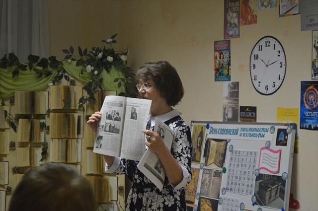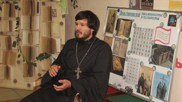 Далее батюшка рассказал о значении славянской письменности и важного духовного чтения. Библиотекарь Ираида Николаевна Тетерина провела беседу о святых братьях Кирилле и Мефодии и литературную игру, а педагог воскресной школы Зоя Георгиевна Романенко - викторину по этой же теме.