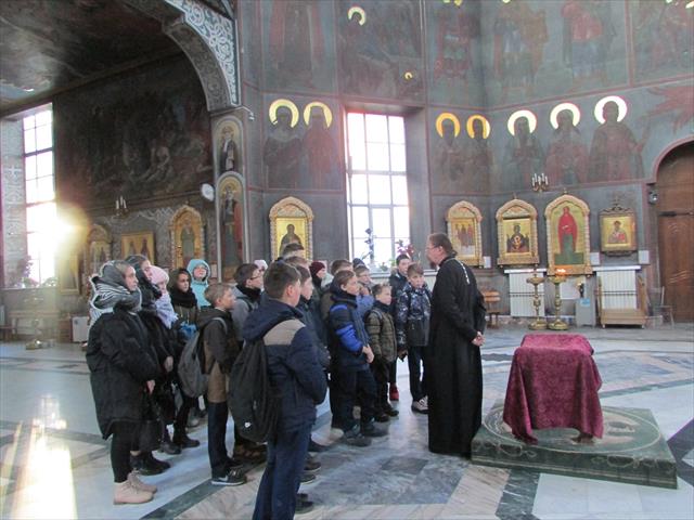 Затем отец Александр поведал, что на Руси всегда было много храмов. Сейчас восстанавливаются, реставрируются, строятся новые церкви, и вместе с тем врачуются души людей. Издавна храмы строили в самых красивых местах, и Покровско-Татианинский собор тому подтверждение - он расположен в очень живописном месте города, возле памятника природы «Роща Гузовского». С большим интересом ребята слушали рассказ священника об истории, архитектуре и внутреннем убранстве храма, из которого узнали, что собор был освящен 17 сентября 2006 года, что 12 купольный, небесно-голубого Богородичного цвета собор построен в византийском стиле и центральный вход предваряется колоннадой, изогнутой с-образной формы.