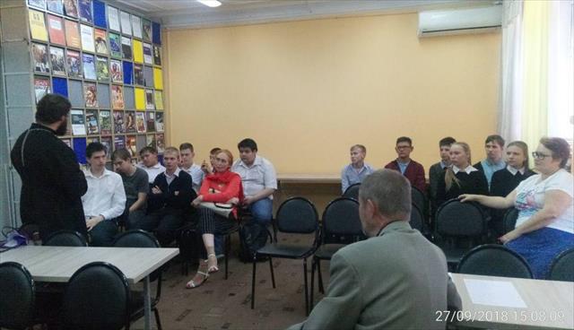 Со старшеклассниками школы № 26 г. Краснодара беседовали духовный наставник клуба «Слово», штатный клирик Храма святого преподобного Сергия Радонежского протоиерей Иоанн Воронов и руководитель проекта «Это едино и свято…» - ведущий методист библиотеки, член Союза писателей России и кандидат филологических наук А.И. Смоленцев.