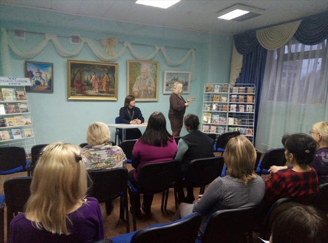 В завершение встречи руководитель Центра духовной поддержки детей и их родителей «МЫ ВМЕСТЕ» - заведующая отделом детской и художественной литературы Центральной городской библиотеки им. В. Маяковского провела обзор литературы, представленной на выставке «Мир православной книги».