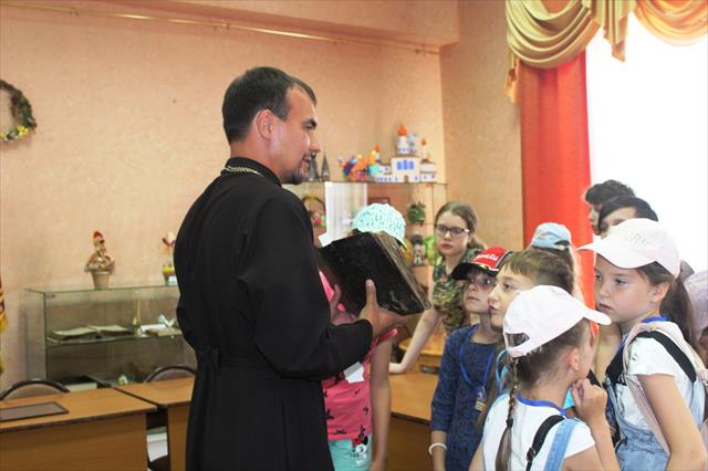Ребят встретил иерей Биробиджанской епархии Алексей Малов, который рассказал о строительстве кафедрального собора, за счет каких средств он был построен. А также о человеке, который заложил основание собора - Архиепископе Иосифе. Руководство собором сейчас осуществляет Архиепископ Ефрем.