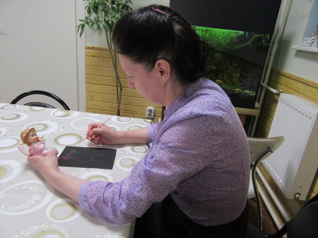 Вечером того же дня прошло занятие для инклюзивной группы в приходском клубе "Тепло домашнего очага". В этот день участники мастер-класса делали необычные гравюры - на черном фоне процарапывались разноцветные узоры. Сюжеты у всех получились различными - цветы, деревья, рыбки, ангел - все эти изображения проявлялись под руками рукодельниц. Хотя работы можно было забрать на память домой, большинство участников группы решили оставить их для благотворительных акций, которые проводит социальная служба храма - теперь они могут принести радость и немного ярких красок пожилым людям, пациентам больниц, малышам и всем тем, кого социальная служба поздравляет с праздниками.