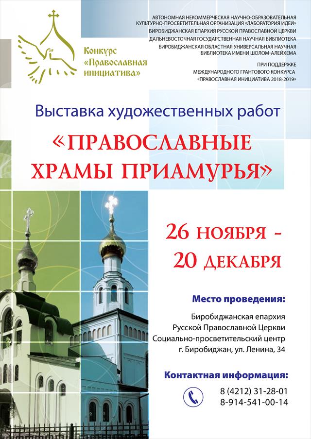 26 ноября 2019 года в конференц-зале Социально-просветительского центра Биробиджанской епархии Русской Православной Церкви в рамках Регионального этапа Международных Рождественских образовательных чтений – XIV Иннокентьевских образовательных чтений «Великая Победа: наследие и наследники» была представлена выставка лучших художественных работ «Православные храмы Приамурья», созданных в рамках проекта «Православные храмы Хабаровска» – победителя Международного грантового конкурса «Православная инициатива 2018–2019».