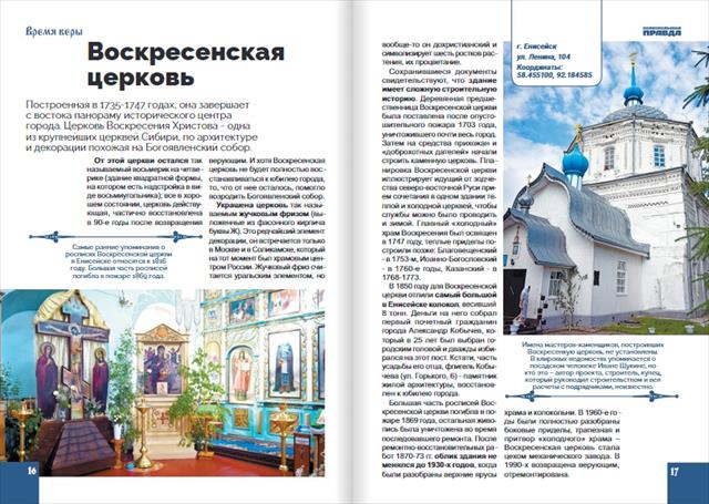 Путеводитель «Православный Енисейск» - это 24 полосы интересной и полезной информации о церквях и монастырях, их святынях и чудотворных иконах. Тираж 3000 экземпляров.