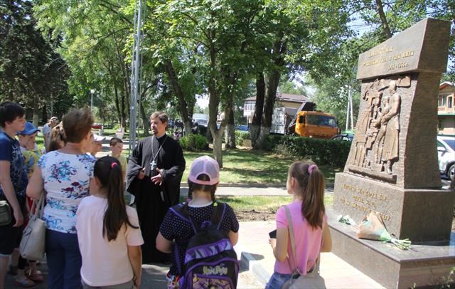 Мероприятие началось с возложения цветов к памятникам Детям войны и Труженикам тыла, установленным на территории сквера, на улице Международной, возле Троицкого прихода, выполненных и установленных на средства депутата городской Думы, председателя совета директоров ЗАО «Торговый порт», члена Попечительского совета Свято-Троицкого прихода, Арменака Тодосовича Артемьева. Перед возложением к ребятам обратился клирик прихода иерей Александр Кушнир. Он напомнил ребятам о том, что в годы Великой Отечественной войны Донская столица дважды была захвачена врагом. За мужество и героизм, проявленный защитниками города в годы войны, Ростову-на-Дону в мае 2008 года было присвоено Почетное звание Российской Федерации «Город воинской славы».