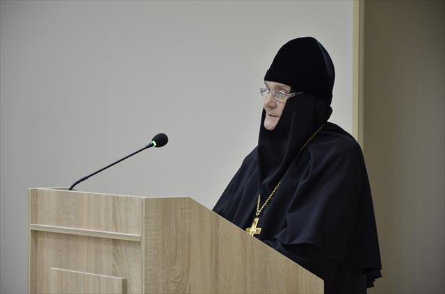 Участников собрания приветствовала настоятельница монастыря игумения Рахиль (Ковалева). В своем слове Матушка обратила внимание присутствующих на взаимосвязь названия проекта «Царская Голгофа» и Иверского монастыря. «Предыдущий монастырь был основан в год рождения цесаревича Алексия и назван Троице-Алексеевским в честь свт. Алексия, митр. Московского – небесного покровителя цесаревича. Согласно преданию, в 1914 году царский кортеж возвращался с Кавказских Минеральных Вод. Достигнув монастырской земли, царь Николай II вместе с цесаревичем вошли под своды монастырского храма, чтобы поклониться Иверской иконе Божией Матери. Предшествующим монастырем было запланировано строительство Троицкого собора на том же самом месте, где сейчас находится нынешний Троицкий соборный храм. Когда мы его построили, то один из пределов был назван в честь Царственных мучеников. В этот год – год 100-летия убиения Царской семьи рядом с Троицким храмом воздвигнут Крест – памятник, символизирующий Царскую Голгофу. Семь членов Царской семьи стоят у подножия Креста. Все приняли мученическую смерть, отсюда и название проекта - «Царская Голгофа», - рассказала настоятельница.