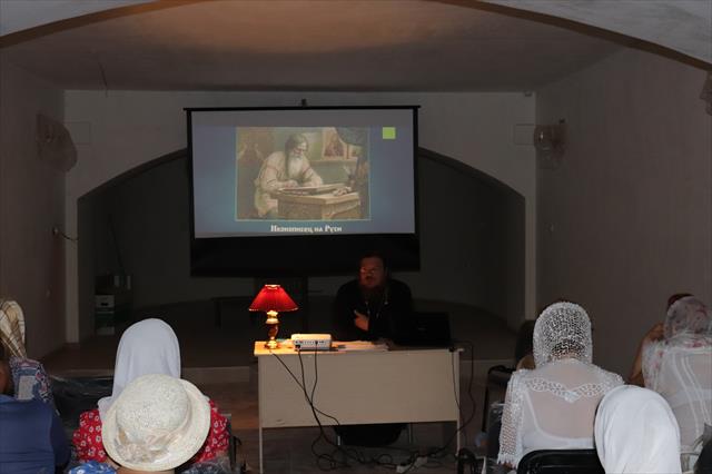 В ходе беседы отец Константин рассказал об истории появления и становления русской иконописи. О том, что в православной традиции икона занимает особое место, и это место определяется тем, что икона — это не только украшение храма и предмет почитания, икона имеет вероучительное значение. С древности икону называли «Библией для неграмотных», «живописным Евангелием», «бессловесной проповедью», «богословием в красках». Ни одно важное событие в повседневной жизни христианина не могло обойтись без организации сакрального действа с помощью иконы. Передаваясь из поколения в поколение, икона в семье становилась святыней, направленной на духовные заветы предков, помогала сохранять традиции и нравственные ценности, гармонизировала всю жизнь человека.