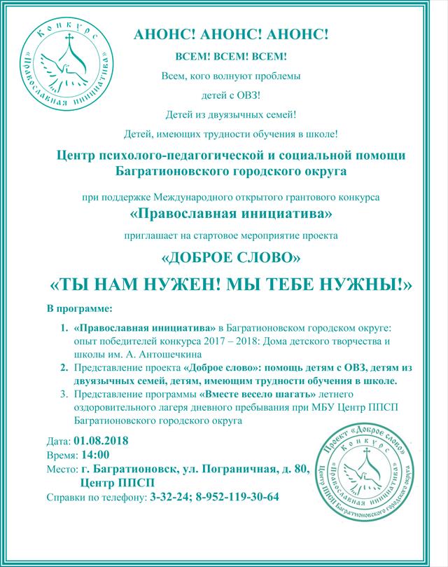 Центр психолого-педагогической помощи Багратионовского городского округа Калининградской области впервые принял участие в конкурсе малых грантов «Православная инициатива» с проектом «Доброе слово» — и победил!
