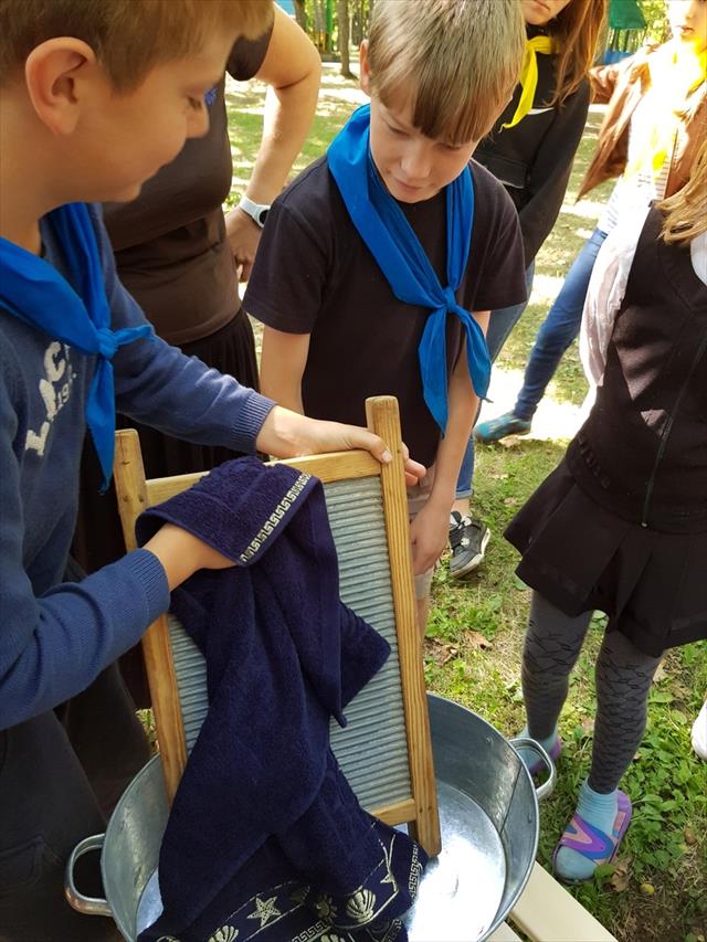 Ребята узнали, как жила православная русская семья в старину, какое место занимали молитва и посещение храма в укладе жизни русских людей. Затем они смогли познакомиться с бытом русского народа: попробовали играть на деревянных ложках, носить воду с помощью старинного настоящего детского коромысла, учились управляться с древним утюгом «рубелем», стирали руками на специальной стиральной доске. Дети не могли поверить, что раньше было так трудно управляться с хозяйством — столько времени и сил уходило на эту нелегкую работу!