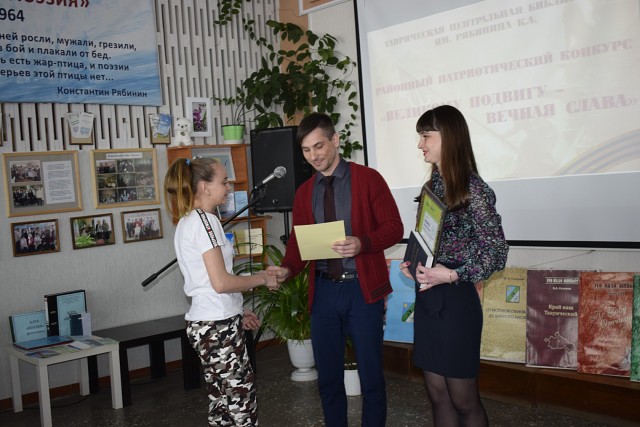 В конкурсе «Великому подвигу Тавричанцев – вечная слава (памятники воинам землякам погибшим в годы Великой Отечественной войны)»: 1 место заняла Соскина Екатерина (ОУ «Луговская школа») 2 место – Сазонов Алексей (ОУ «Таврическая школа») 3 место – Пилипенко Галина (ОУ «Таврическая школа»).