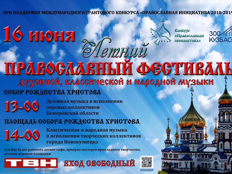 16 июня в 13-00 состоится Летний православный фестиваль духовной, классической и народной музыки, который проводится при поддержке Международного грантового конкурса «Православная инициатива 2018-2019». Праздник пройдет в Соборе Рождества Христова (г.Новокузнецк, ул. Зыряновская, 97).