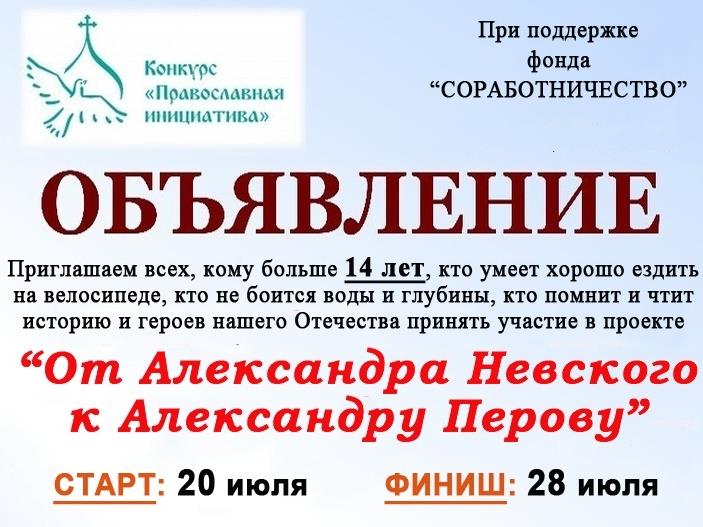 В преддверии 800-летия со дня рождения святого благоверного великого князя Александра Невского с 20 по 28 июля 2019 года в Нижегородской области пройдет межрайонная патриотическая "Комбинированная туристско-исследовательская экспедиция "От Александра Невского к Александру Перову".