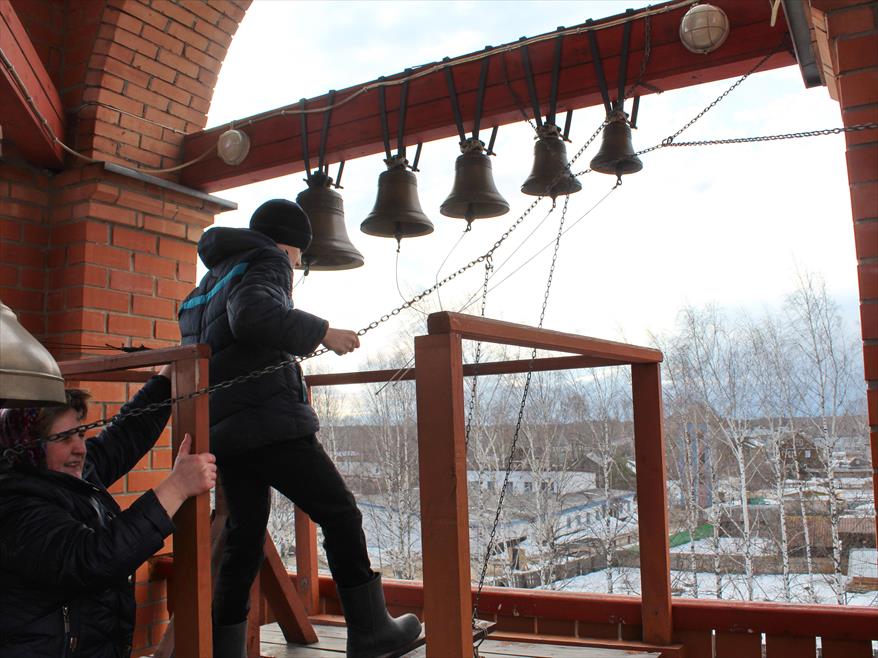 В период Пасхальных торжеств с колокольни храма в честь Всех святых г. Нефтеюганска ХМАО- Югра по городу разносился, может быть, и не такой стройный, как обычно, но очень радостный колокольный звон.